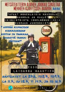 la 27.6. klo 14.30 Metsäteatterin hulvaton, humoristinen kesäteatteriesitys ”Esso laidassa maantien”. Huittulantie 327, 37700 Sääksmäki, Valkeakoski. Info ja lipunmyynti: loistovirma@gmail.com